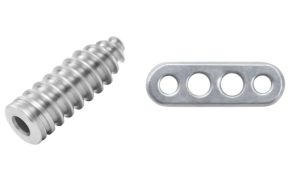 ▲锌合金可降解界面螺钉(左)和带袢锌板(右)